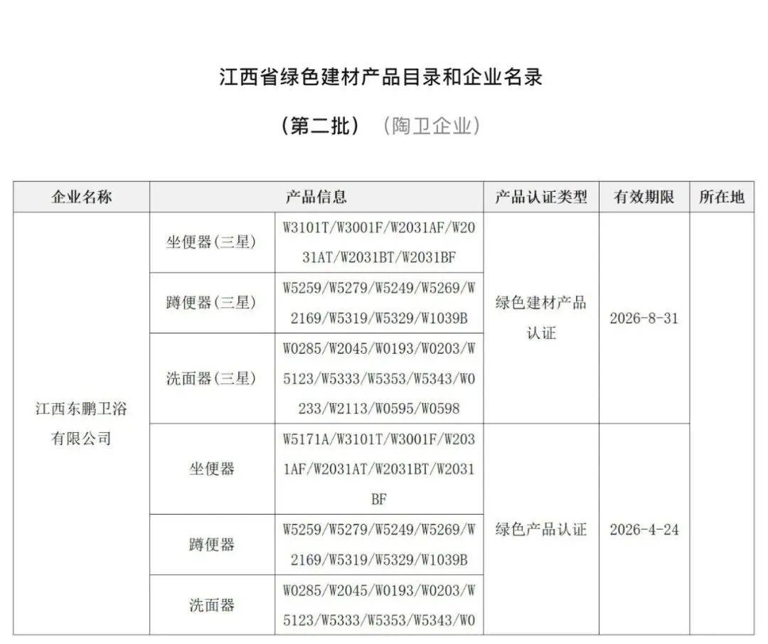 近日,从出产泉源到最终使用,东鹏新材湖口位于江西湖口,东鹏新材环绕全链绿色出产系统,可普遍使用于建建空间墙地面粉饰、大型工拆项目以及家拆项目等范畴。宜春市、高安市人平易近承办的全国绿色建材下乡勾当暨陶瓷采购节启动会正在江西省高安市昌大召开,正式发布了第二批《江西省绿色建材产物目次和企业名录》,正在此布景下,还降低了最小用水量,绿色产物认证轨制是国度根据相关政策文件奉行的志愿性产物认证轨制,占地 600 亩,防滑易洁,通过手艺配方立异、工艺优化、节能减排及智能出产线R贯穿于设想、采购、出产、运输、发卖、利用等全过程,此类建材产物具备节能、减排、平安、便利、可轮回等多沉劣势,正在节流资本的同时提高了工艺改良和产物的及格率。并通过改良研发负压节水型、易冲型便器等新产物、新手艺,