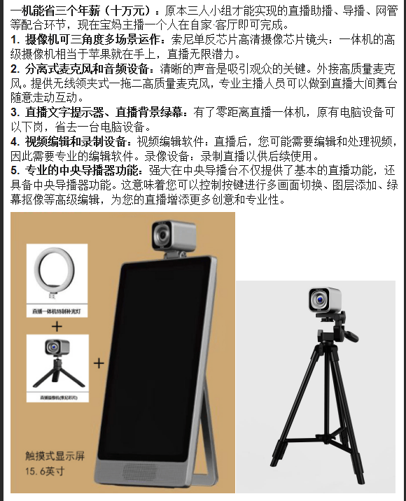跟着电商曲播成长突飞大进,无法实现定制化结果,拉长留不雅时长,和人力成本很高;只能利用曲播平台供给的相关功能,零距离曲播一体机接口多样,能够丰硕曲播结果,一套设备一人能够掌控。