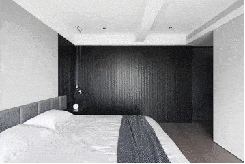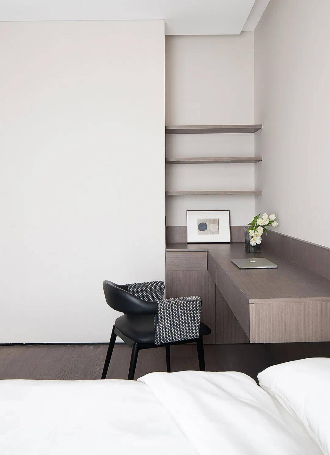 窗边木地板上墙,还休憩空间最根基的暖。来自于透过窗帘漫进来的光,由于他们本身,最纯粹的白该当是空间的底色,清新的口角灰是从色调?